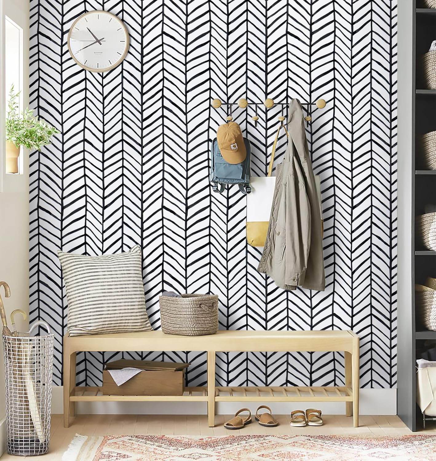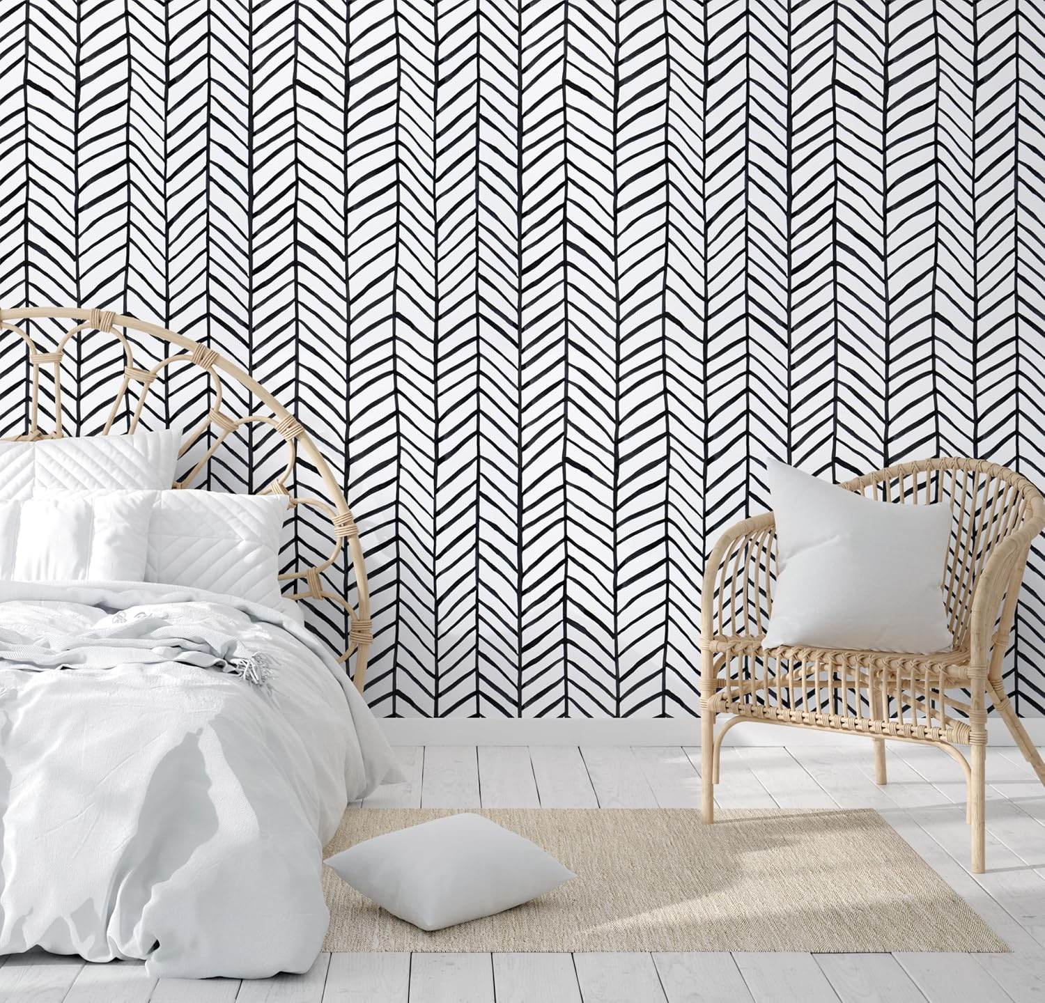 Featuring a bold chevron pattern in crisp black and white, this wallpaper blends Scandinavian minimalism with bohemian warmth. Its clean lines and neutral tones make it a perfect match for entryways, living rooms, bedrooms, or home offices.