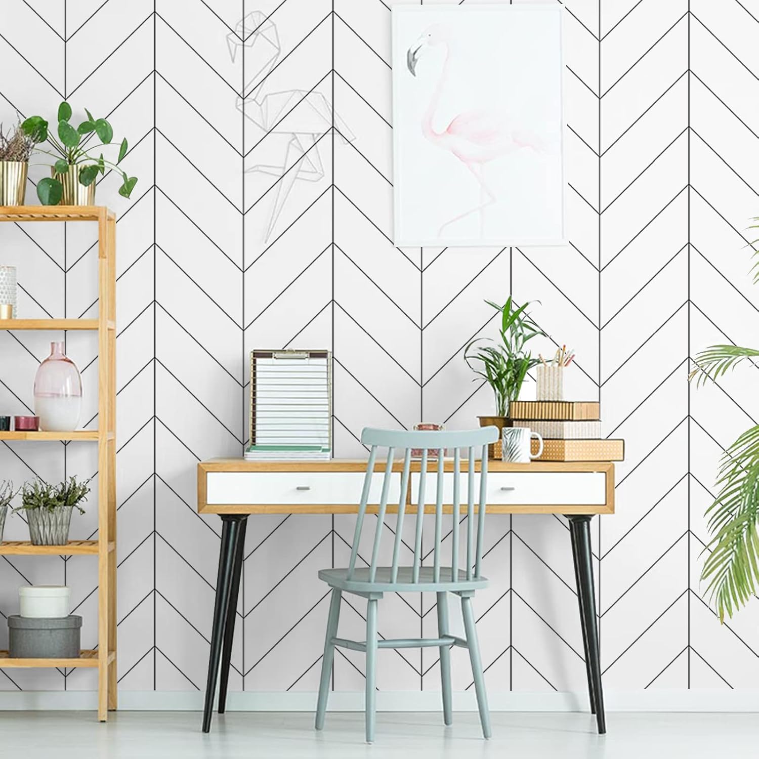 The Black & White Chevron Peel and Stick Wallpaper features a bold, oversized chevron pattern in a black and white palette. Its graphic lines create a modern Scandinavian-inspired look that works well as a backdrop in living rooms, bedrooms, offices or on accent walls.