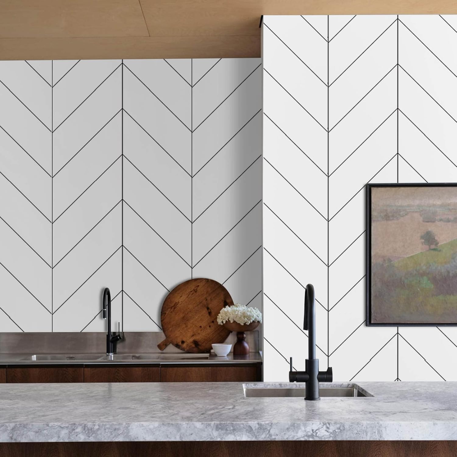 Made from waterproof PVC wallpaper, offering a stylish modern chevron pattern with excellent durability, easy cleaning, and moisture resistance.