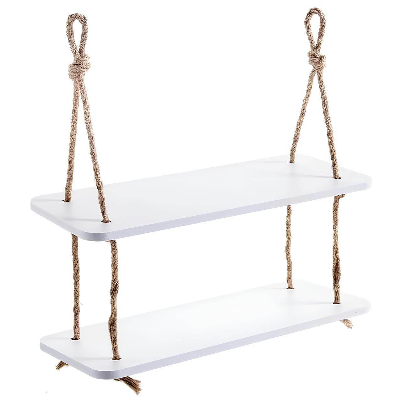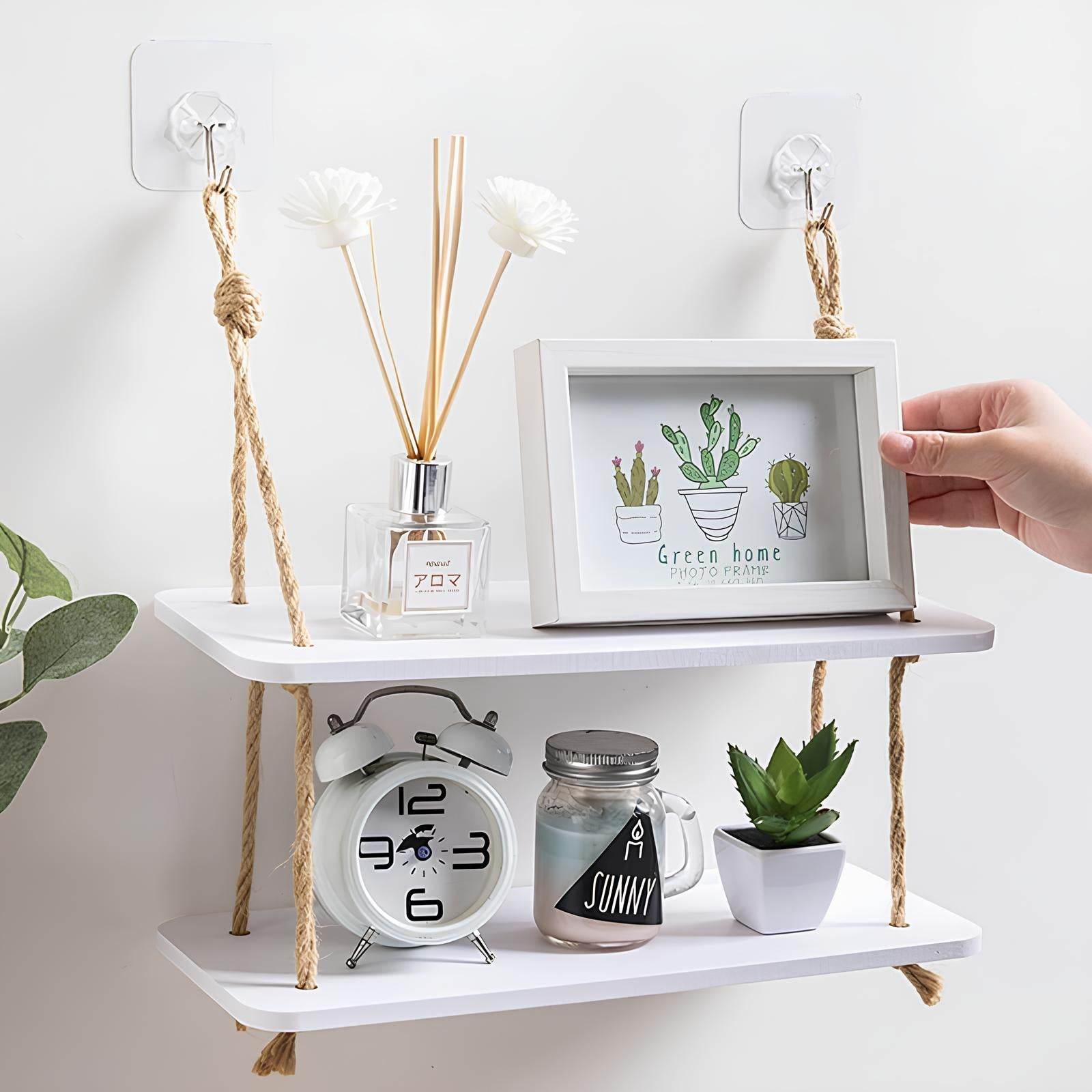 The Double Hanging Rope Shelf features two tiers of white painted wooden boards suspended by natural rope. This design combines practical storage with a modern rustic look, making it suitable for living rooms, bedrooms, kitchens or offices. It provides space for plants, books, picture frames, candles or other small décor items while adding a simple decorative accent to your wall.