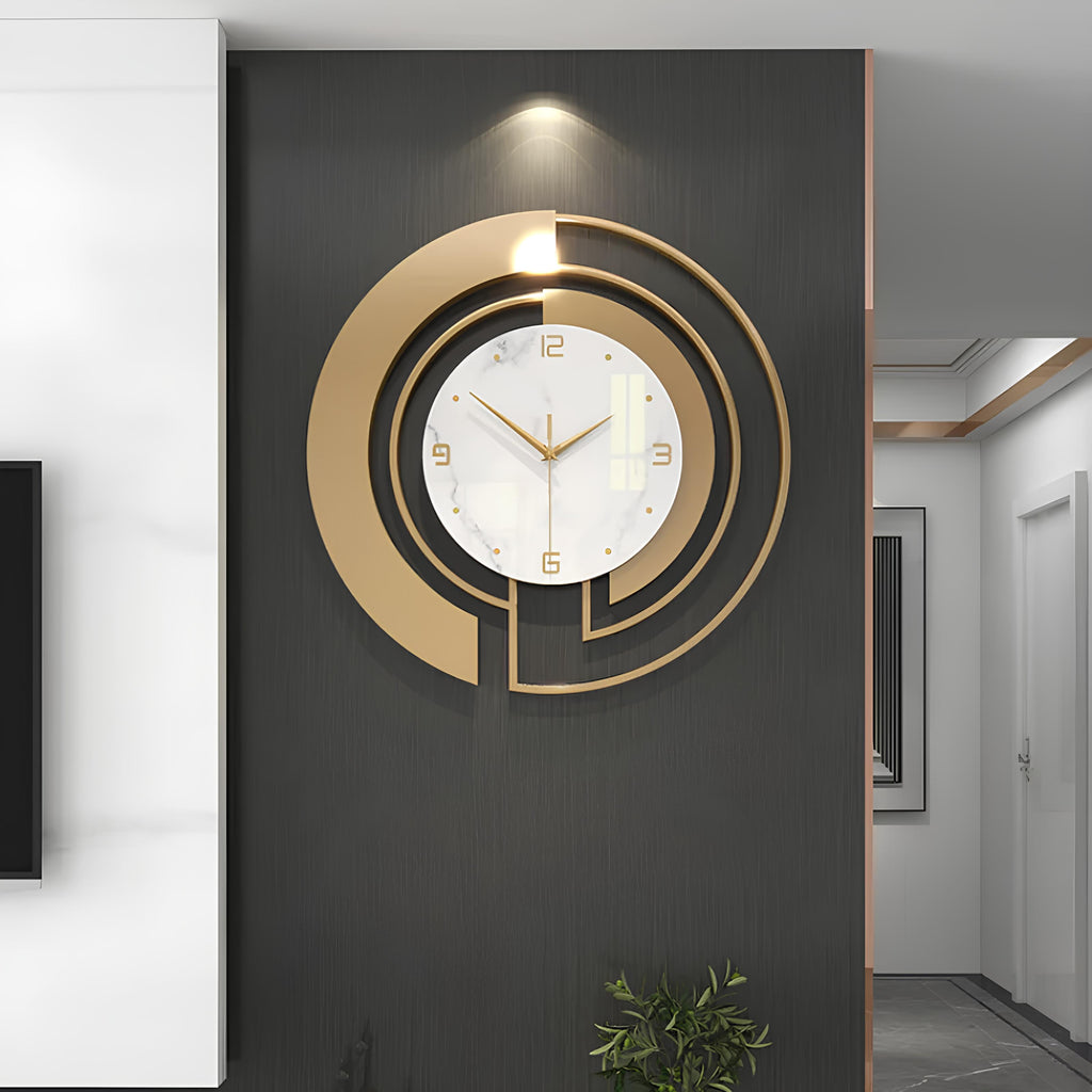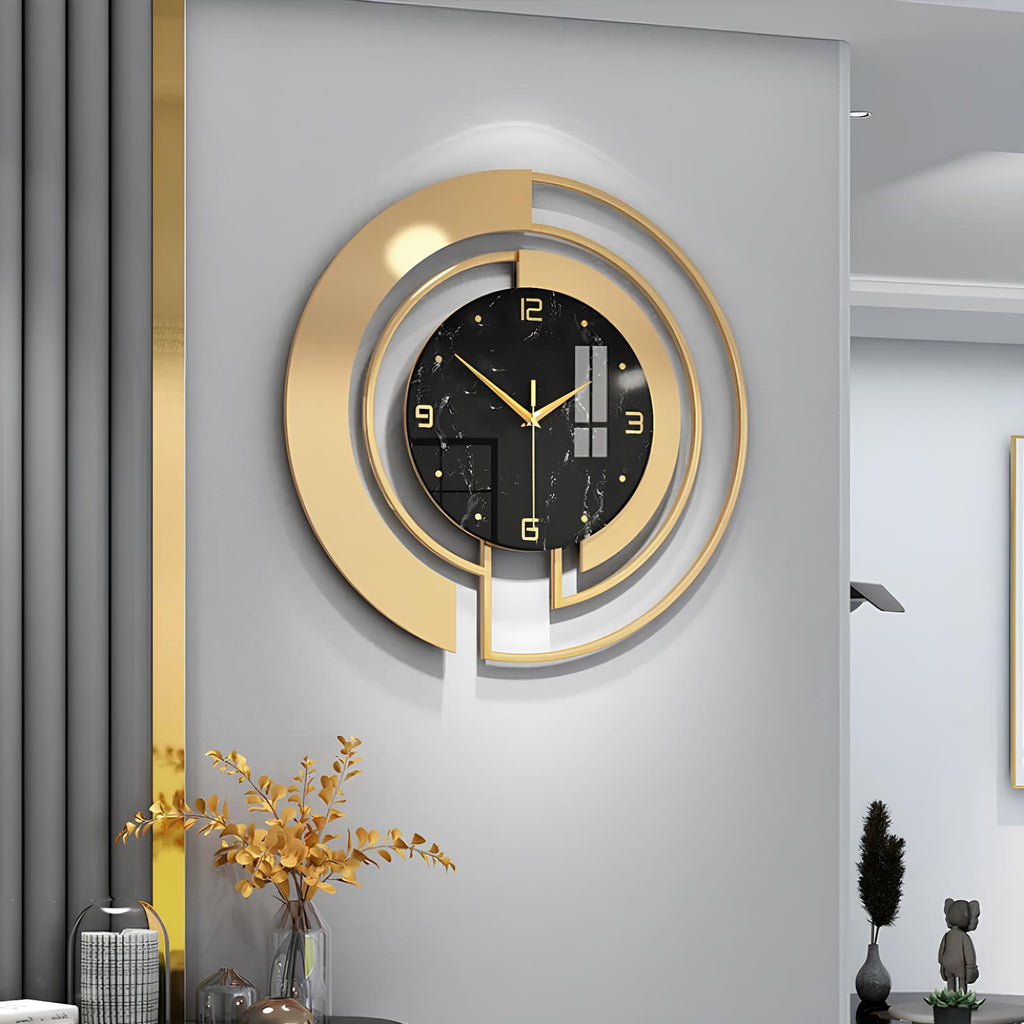 The Modern Decorative Wall Clock features a gold metal frame with concentric rings and a central marble-effect dial with gold hands. This design combines a geometric look with a decorative finish, making it suitable for living rooms, dining rooms, entryways or offices as both a timepiece and a wall accent.