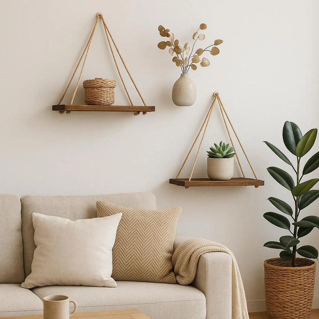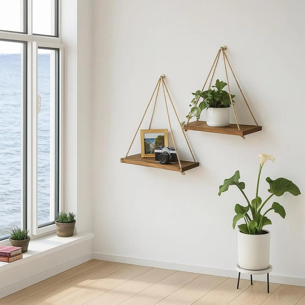 The Scandinavian Hanging Shelf is made from a solid wood board suspended by natural rope, combining a simple design with a warm, organic look. Suitable for living rooms, bedrooms, kitchens or entryways, it provides a practical way to display plants, books, candles or decorative accents while keeping surfaces clear.