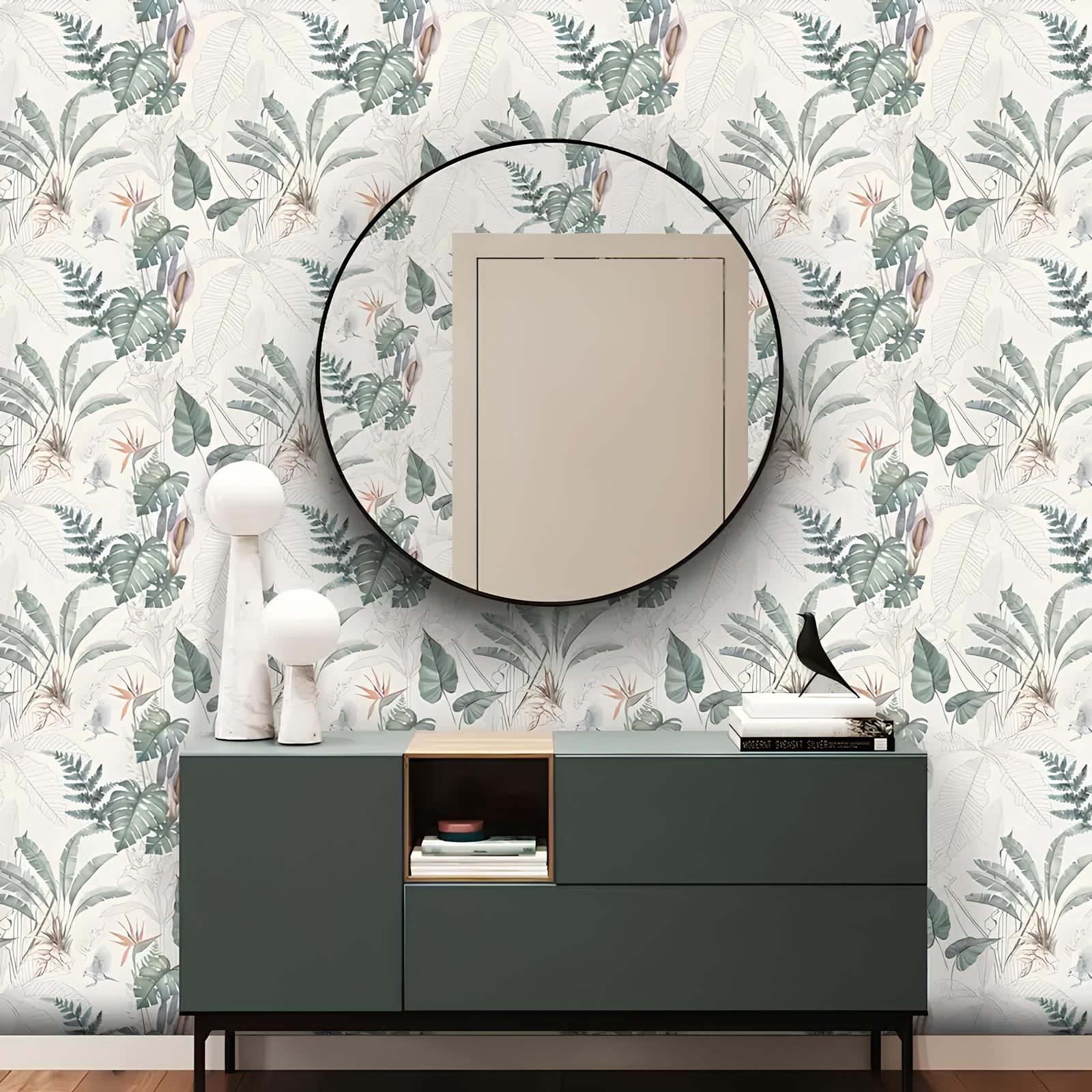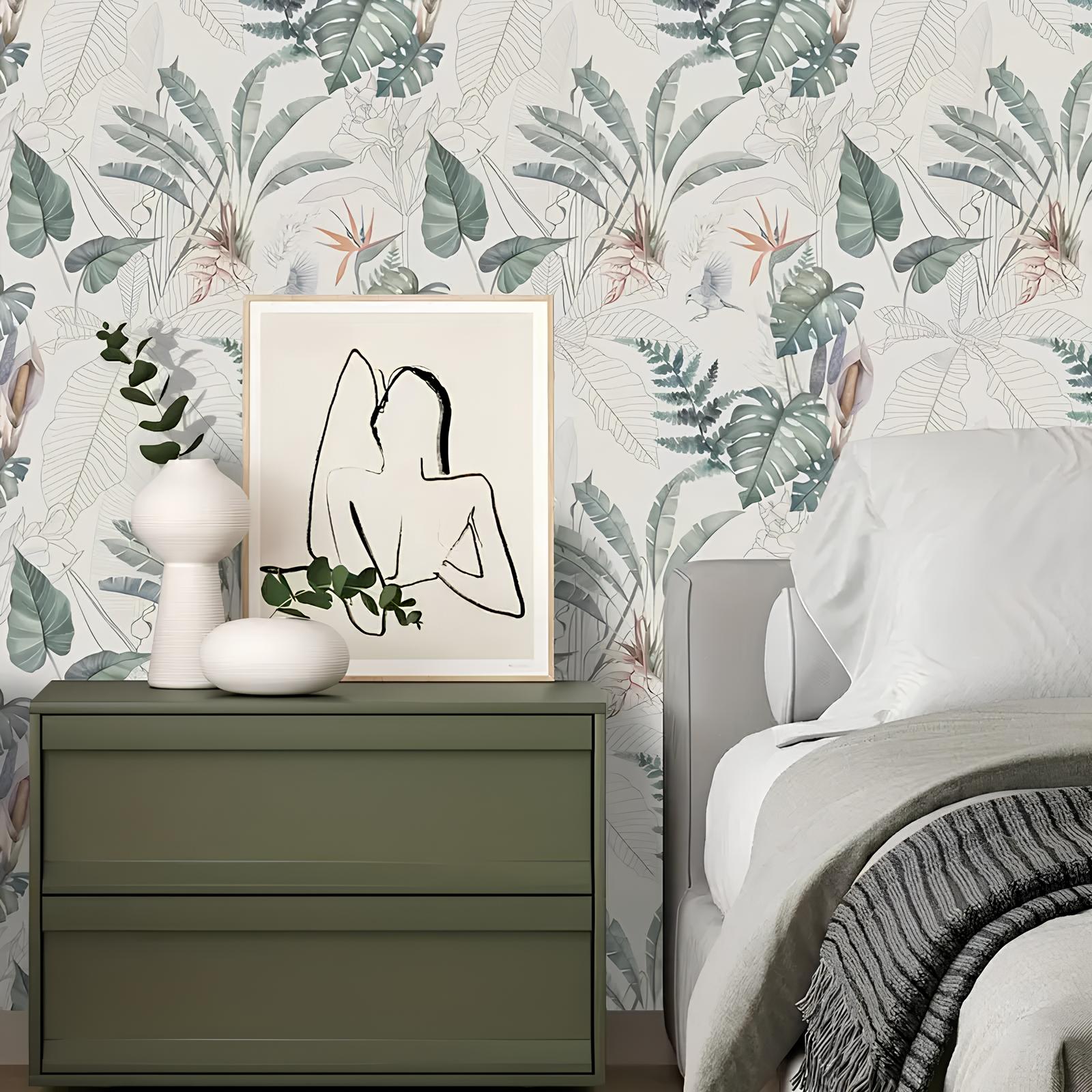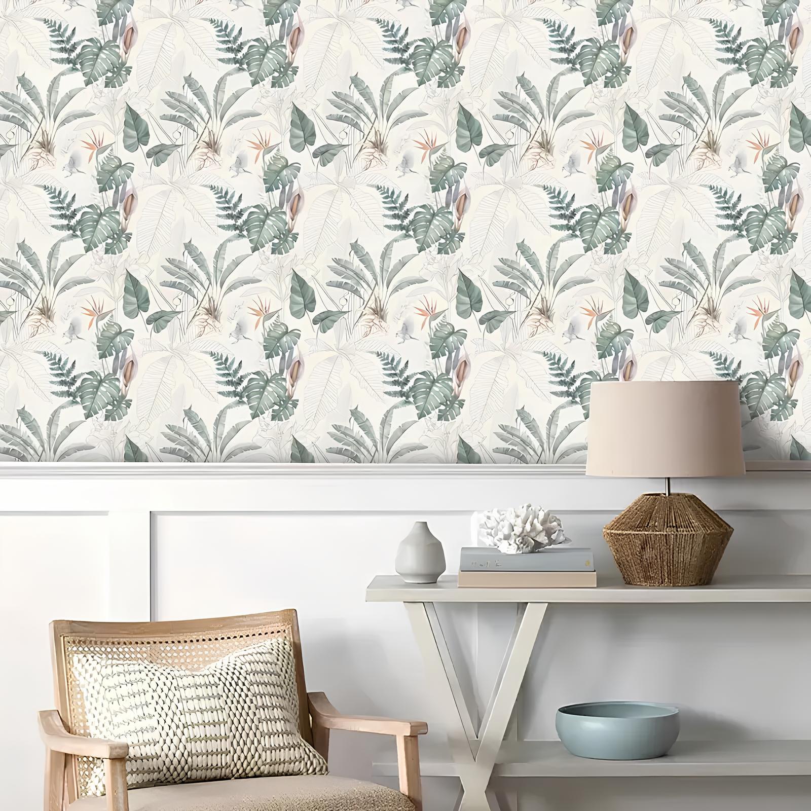 The Tropical Leaf Peel and Stick Wallpaper features banana leaves, monstera and ferns in soft green and muted tones. This botanical design brings a nature-inspired look to bedrooms, living rooms, dining areas or accent walls and pairs easily with modern minimalist or boho-chic interiors.